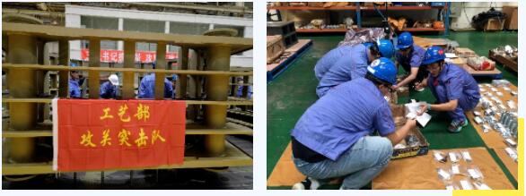 2022年6月,萬家寨大泵電機進入收尾攻關階段,為保證高質(zhì)量按期交付,核電制造部黨支部聯(lián)合工藝部、生產(chǎn)部、物資供應部等9個部門黨支部,開展了“保交付”助力民品生產(chǎn)聯(lián)學聯(lián)做攻關活動。每日從7:50至20:40分組持續(xù)進行裝壓作業(yè),自6月17日至7月8日期間職能部門參加攻關人數(shù)900余人次,完成了中鋼唐山項目4臺粗軋電機的定子裝壓,萬家寨項目泵部件4臺份680余項5000余件總裝發(fā)車件的清點工作。