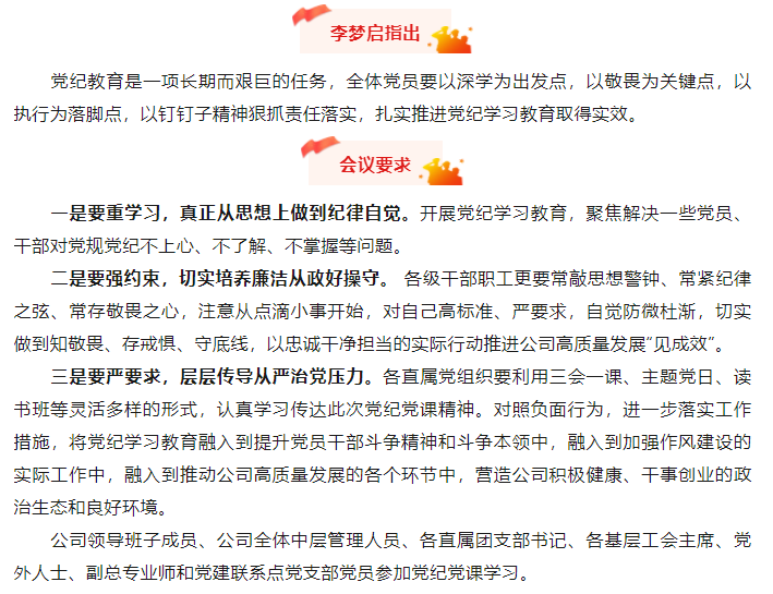 李夢啟圍繞深入學習領悟習近平總書記關于加強黨的紀律教育的重要論述、準確把握新時代加強黨的紀律教育的重要經驗、準確把握新修訂《條例》的主旨要義和規(guī)定要求、深刻把握新形勢新任務新要求,進一步增強推動高質量發(fā)展的使命感責任感緊迫感四方面內容,結合黨紀學習的必然要求和重點內容,從全面從嚴治黨論述的理論高度和黨紀學習教育開展的實踐深度,深入解讀了新修訂的《中國共產黨紀律處分條例》,對公司各級黨組織更好地學習領會中央和上級黨紀學習教育精神,推動公司黨紀學習教育走深走實具有重要的啟發(fā)和指導作用。